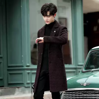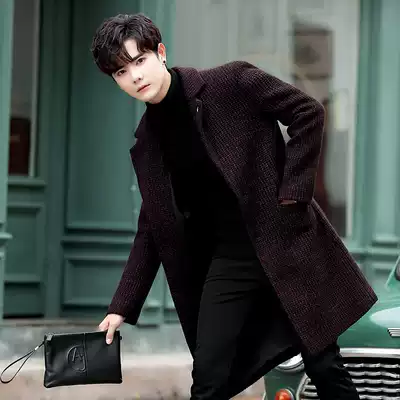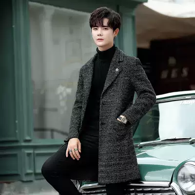 Plaid woolen coat men's middle and long version spring and autumn Korean version of slim Nizi trench coat men's woolen country tide coat tide