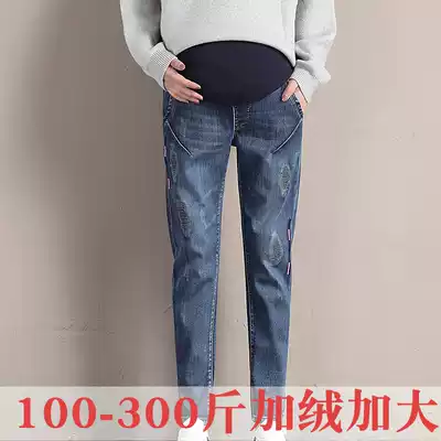 200 Jin plus fat plus size maternity pants autumn and winter Korean denim straight trousers fat mother MM loose plus Velvet