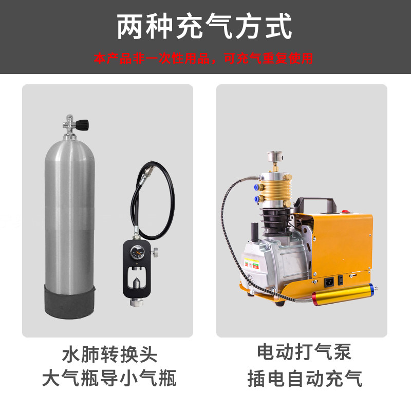 1L green (including bottle + tube + secondary head + respirator) 1L black (including bottle + tube + secondary head + respirator) 1L orange (including bottle + tube + secondary head + respirator) 1L cylinder + upgraded version of scuba conversion head 1L cylinder + electric pump black silicone bite (frosted version) scuba conversion head (upgraded version) electric pump cloth back clip 12V vehicle high pressure air pump large oil-water separator manual air pump