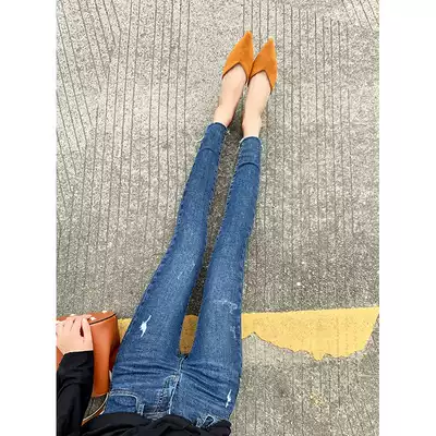 Dark blue high waist stretch jeans women's small feet trousers 2021 Spring and Autumn New thin burrs elastic pencil pants