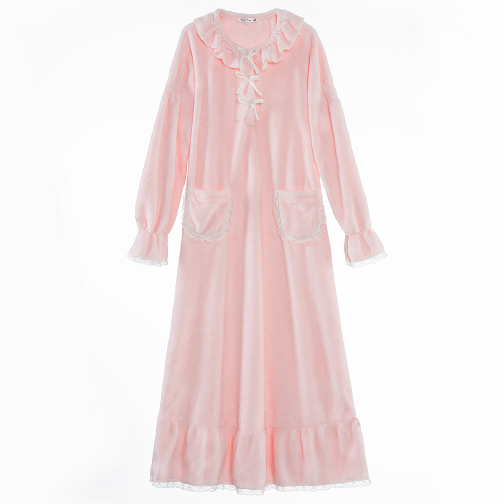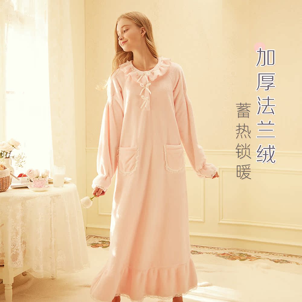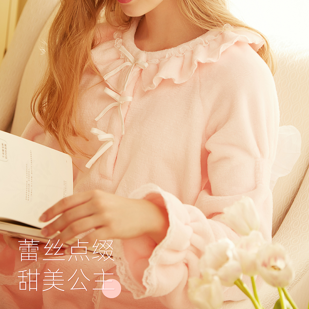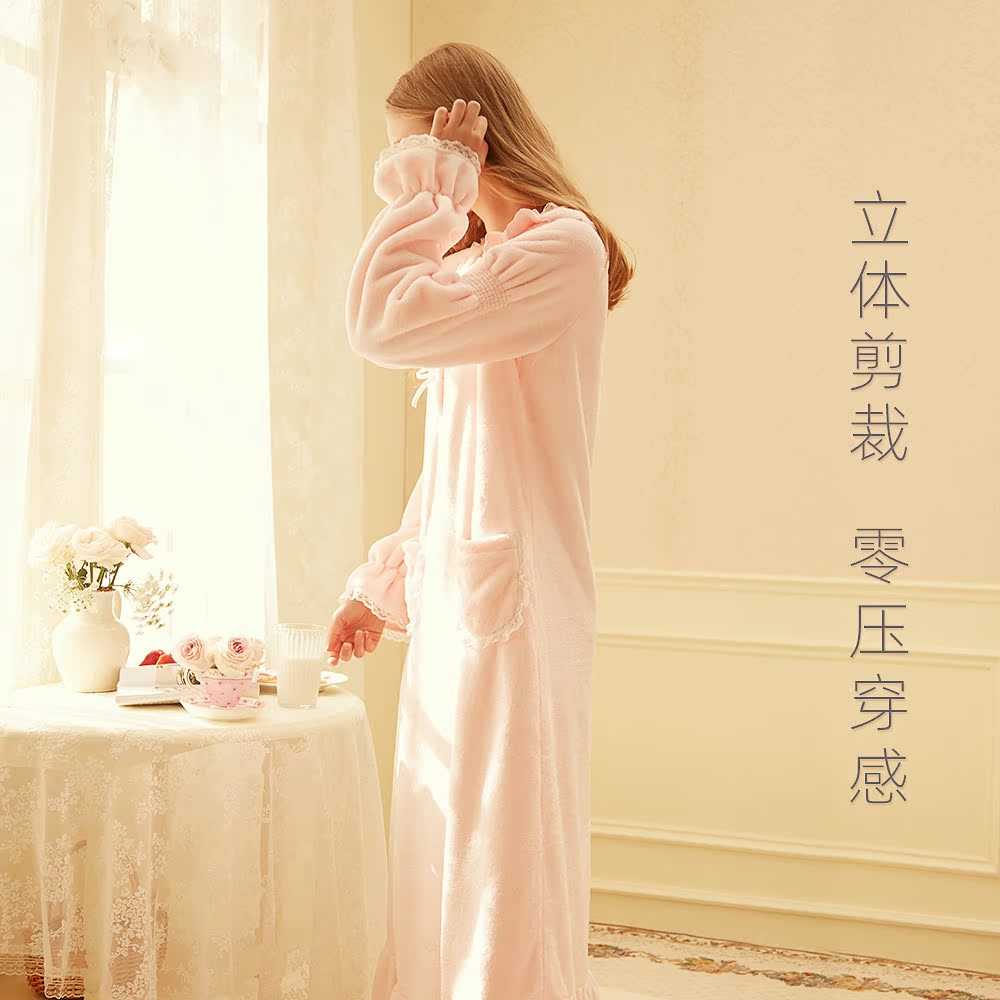 RoseTree coral velvet pajamas Women's autumn and winter long-sleeved warm sweet cute princess wind flannel long version night dress