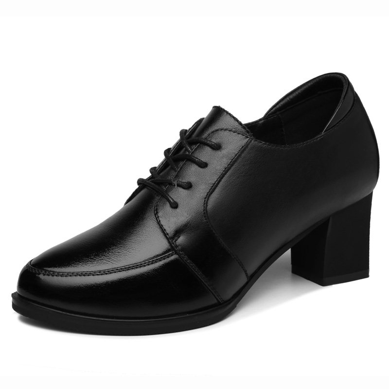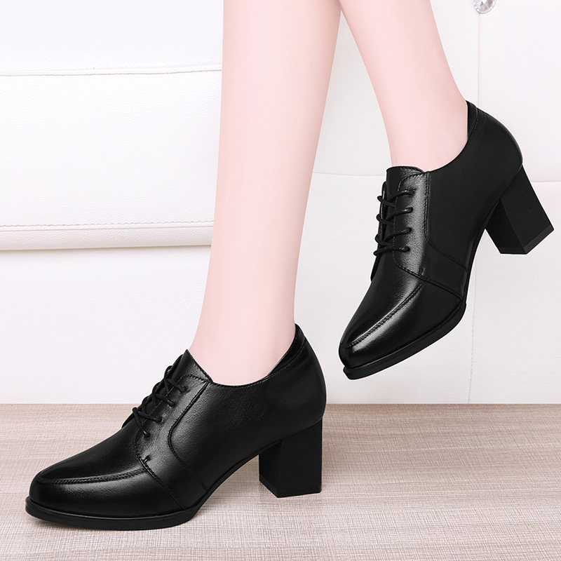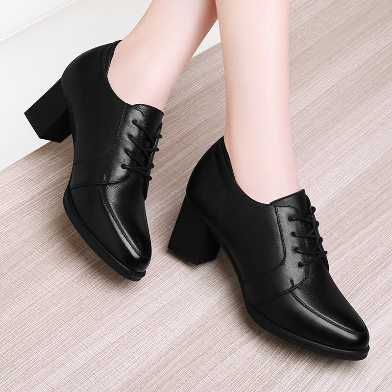 Leather high heels thick heels spring women's shoes 2021 new medium heel shoes black leather shoes comfortable work shoes