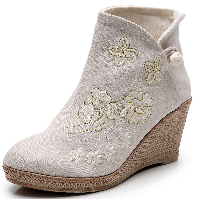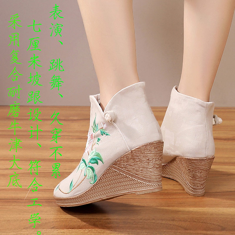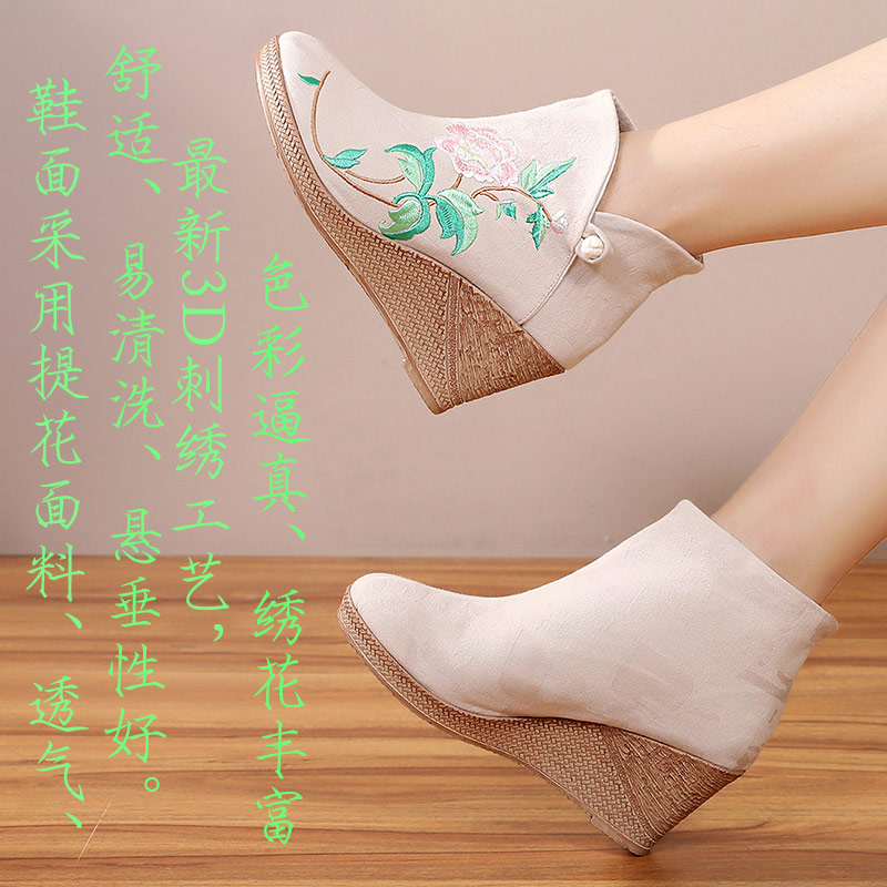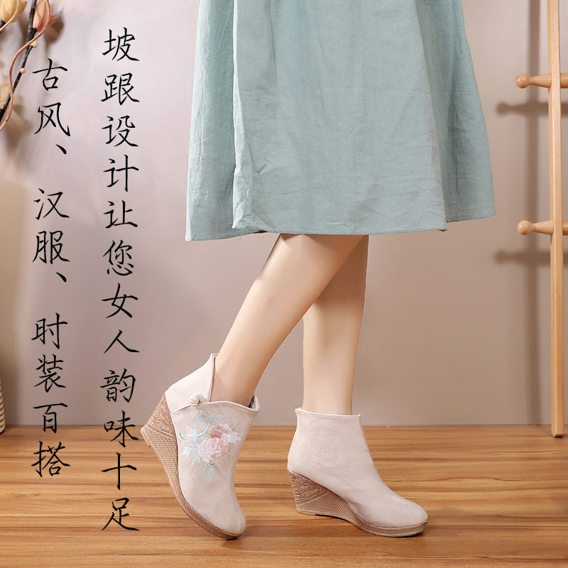Autumn and winter tea clothes wedge heels short boots old Beijing cloth shoes women's high-heeled cheongsam shoes ethnic ancient Hanfu embroidered cotton shoes
