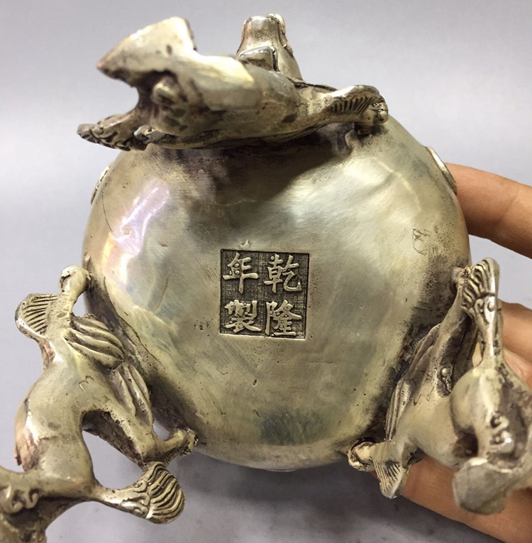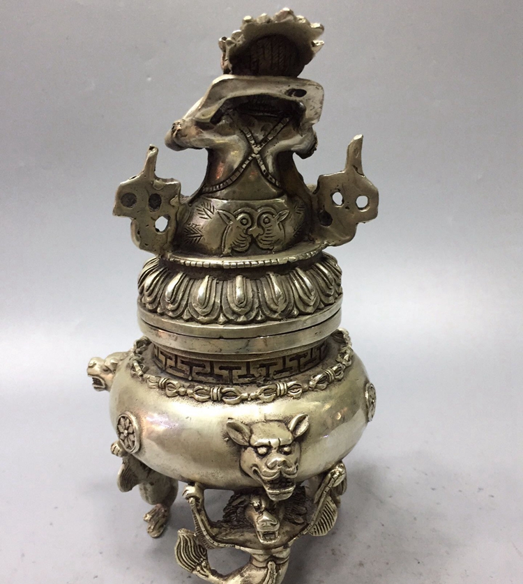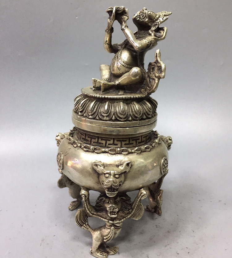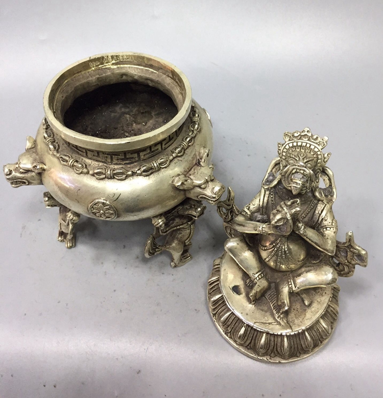 Tibetan old white copper gilt silver diamond hand Buddha statue incense burner crafts home supplies decoration collection