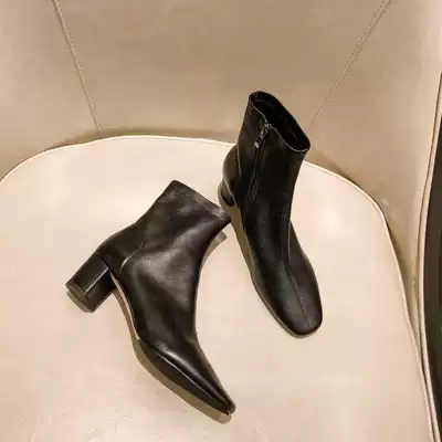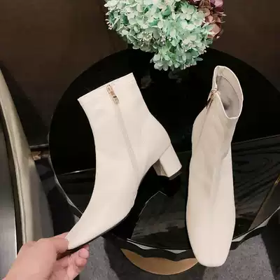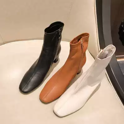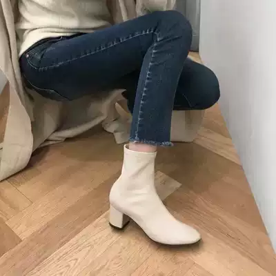 MDyy light luxury self-retention giant good wear @ white thick leather elastic short boots middle heel thin boots Martin boots female