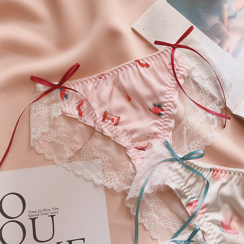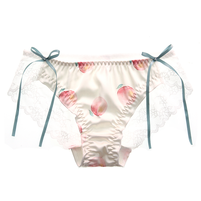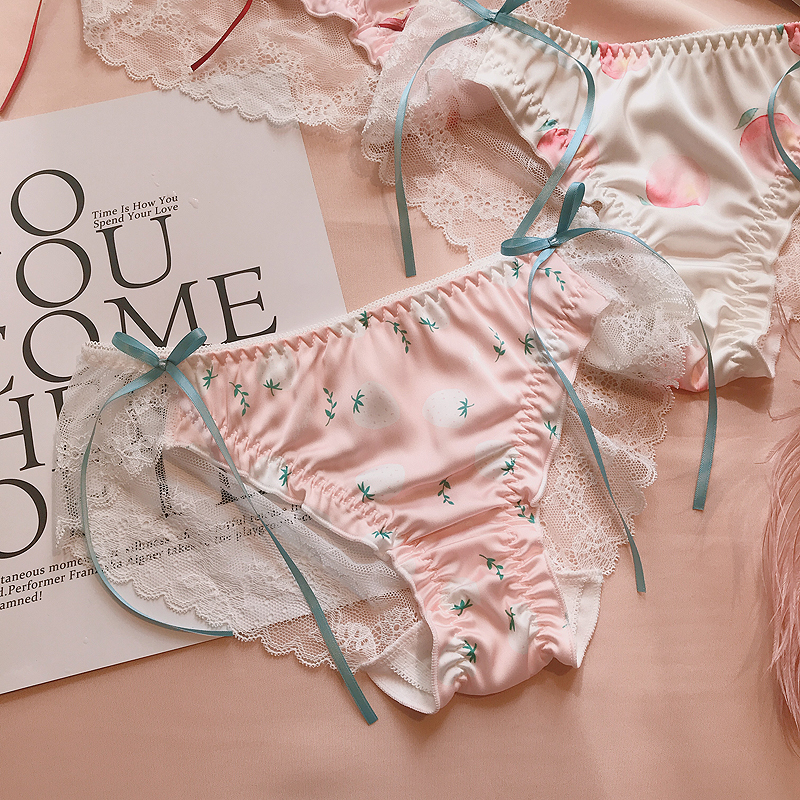 Lace girl underwear ladies ribbon Japanese shorts fruit peach women's satin seamless sexy mid-waist briefs