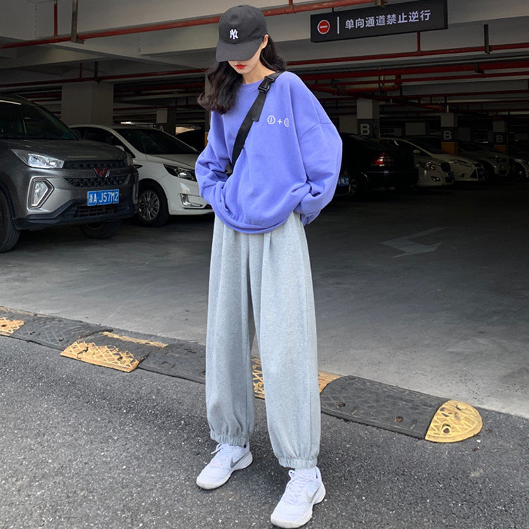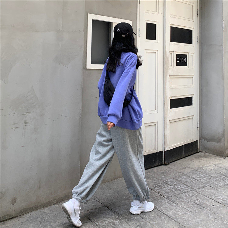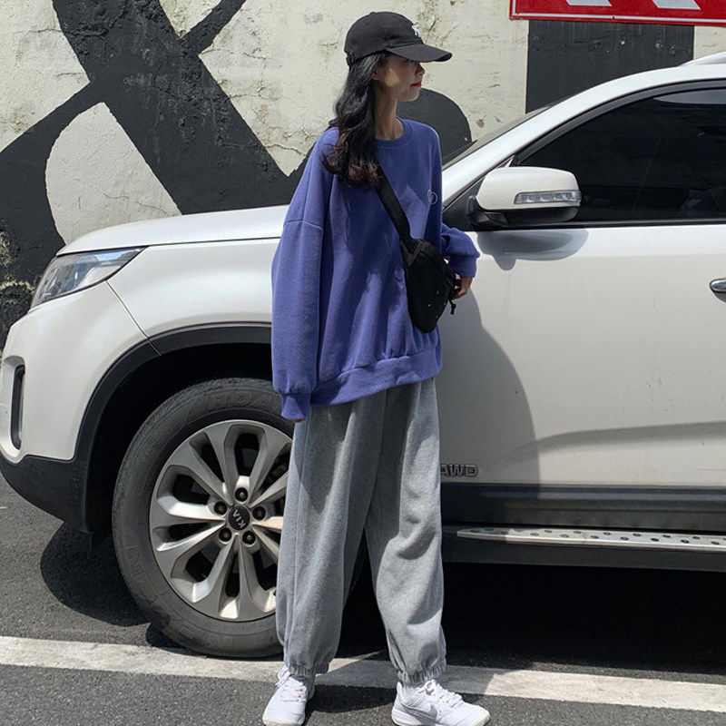 Blue sweatshirt gray long pants for a long time.