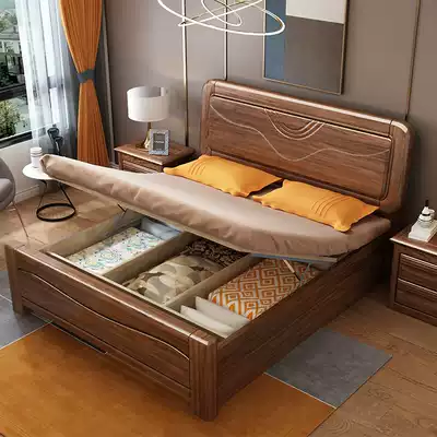 Solid wood bed 1 5 m double bed 1 8 black walnut master bedroom New Chinese small apartment with drawer storage wedding bed