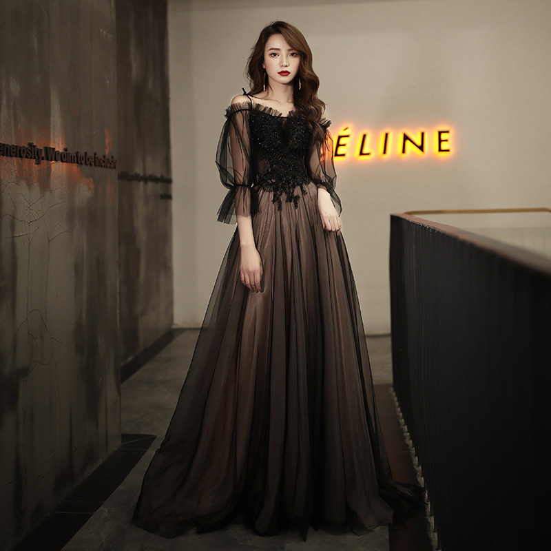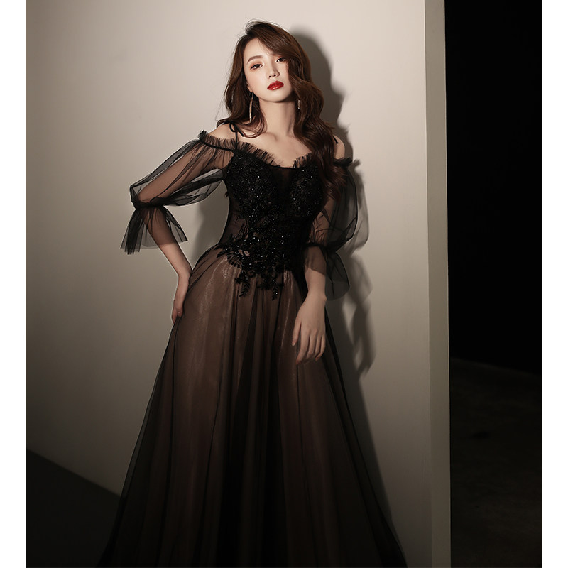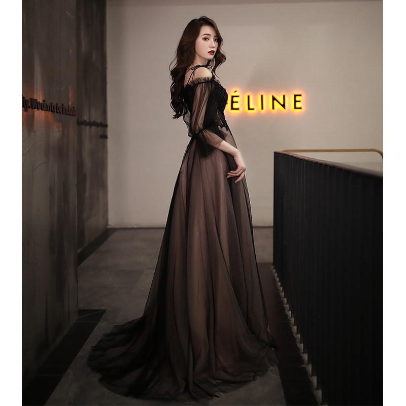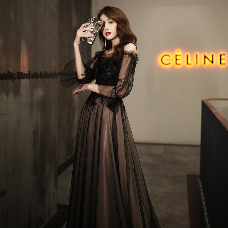 Black evening dress women's high-end banquet 2022 new temperament annual meeting retro French court dress long version one-shoulder