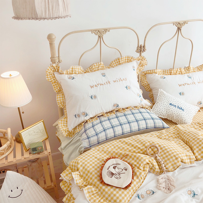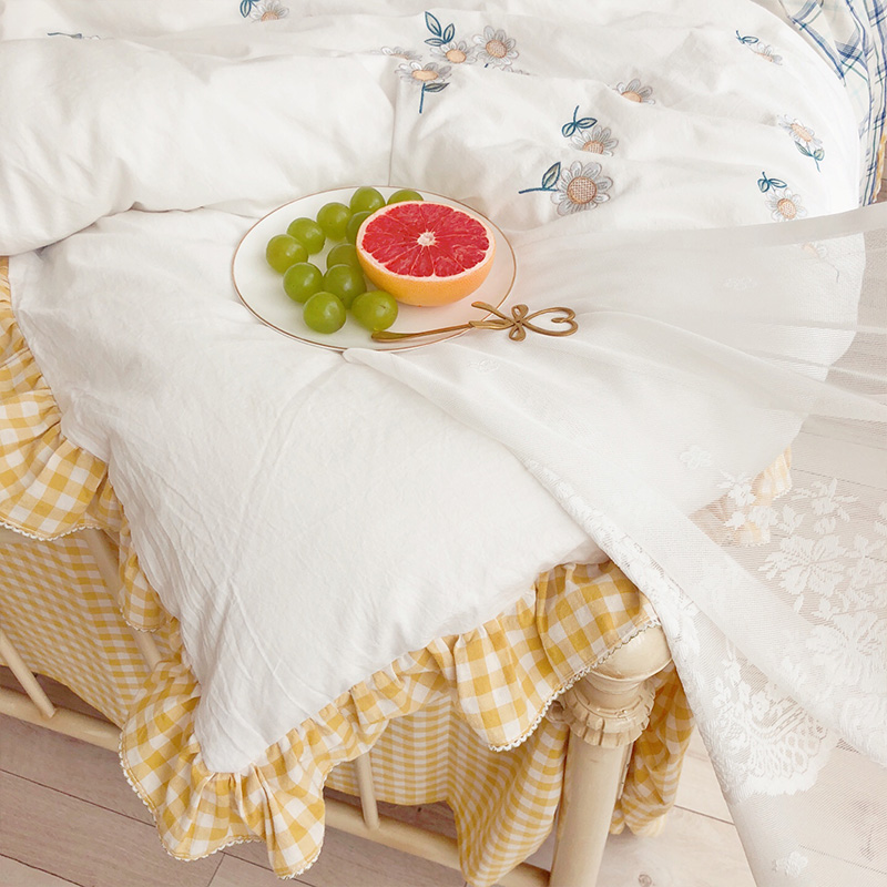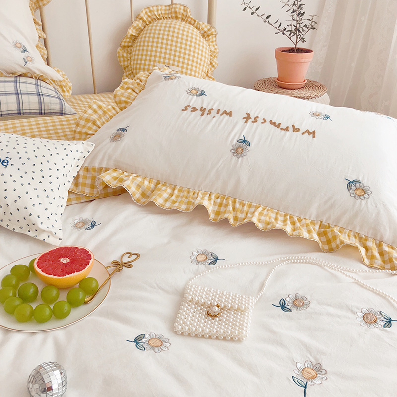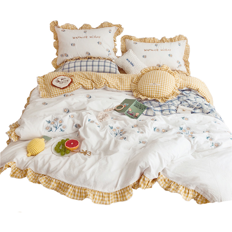 Embroidery lotus leaf edge cute little fresh girl Heart male main wind washed cotton pure cotton four-piece type full cotton sheet quilt cover