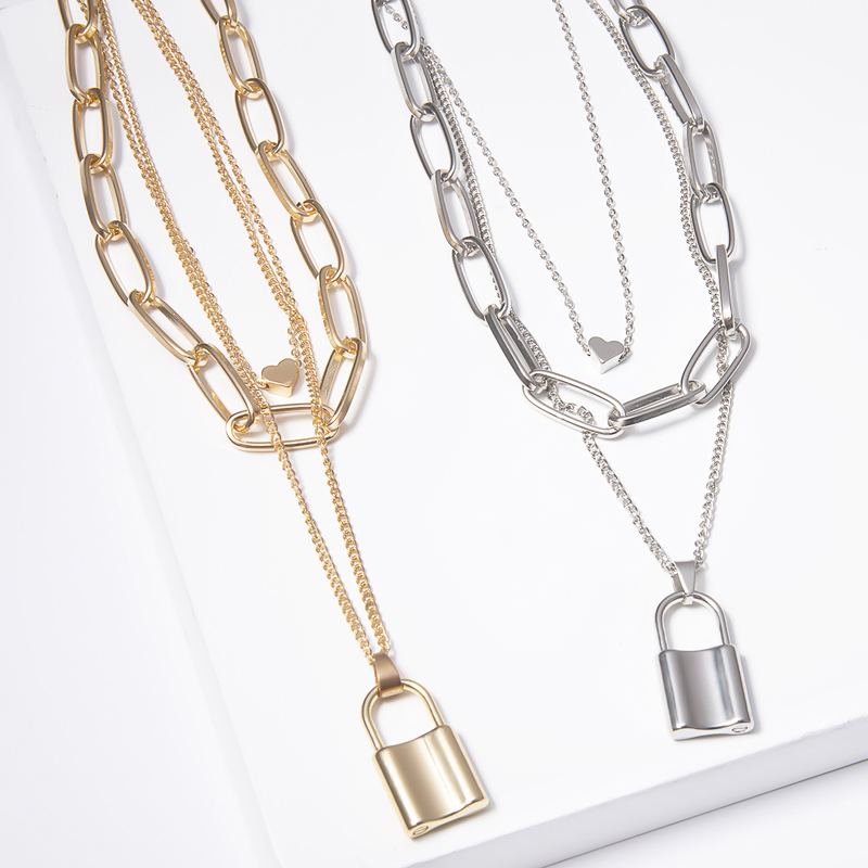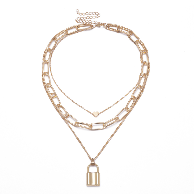 Small lock peach heart pendant three-layer necklace female soil cool dance ins cool necklace female trendy hip-hop net red choker