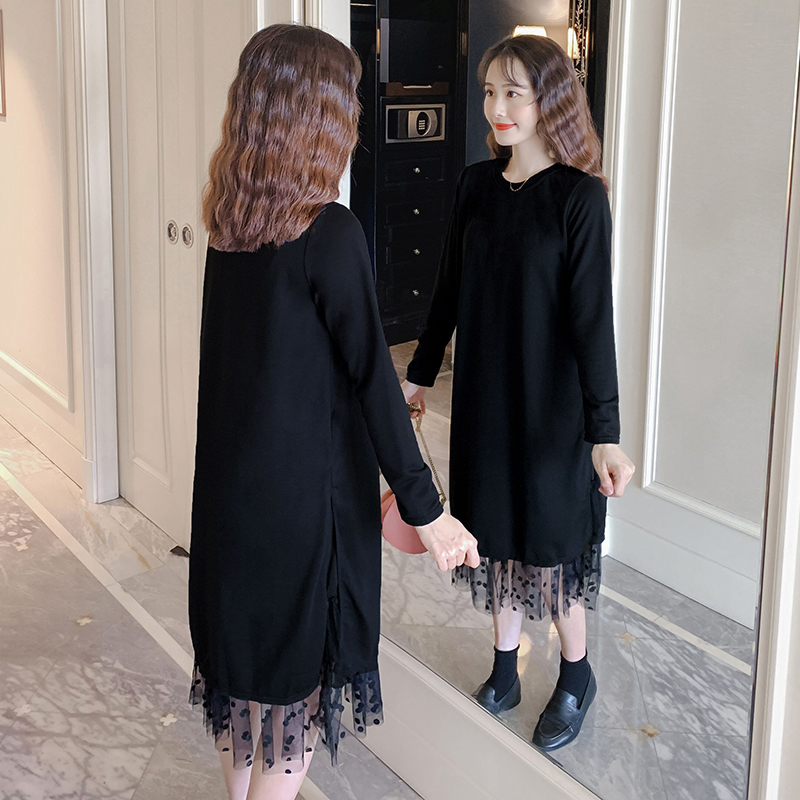 Pregnant autumn round neck long sleeve medium and long version of the T-shirt skirt fake two-piece lace stitching temperament is thin dress woman