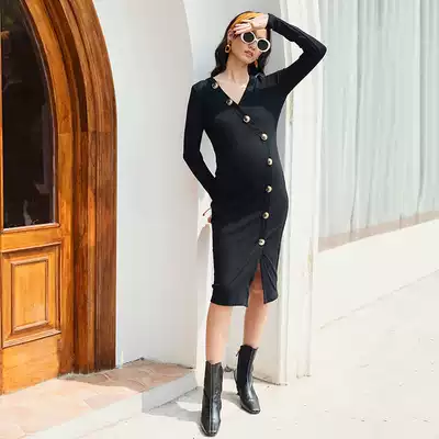 BELLYWEAR pregnant women autumn and winter dress spicy mom's new slim-fitting V-neck LONG-sleeved out-of-home knitted nursing skirt