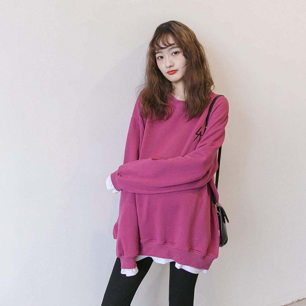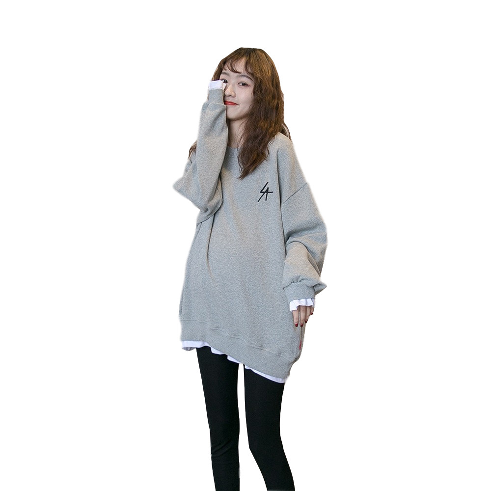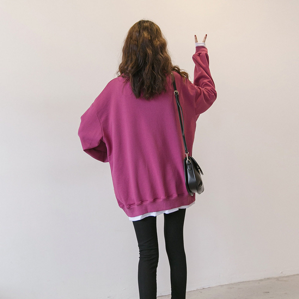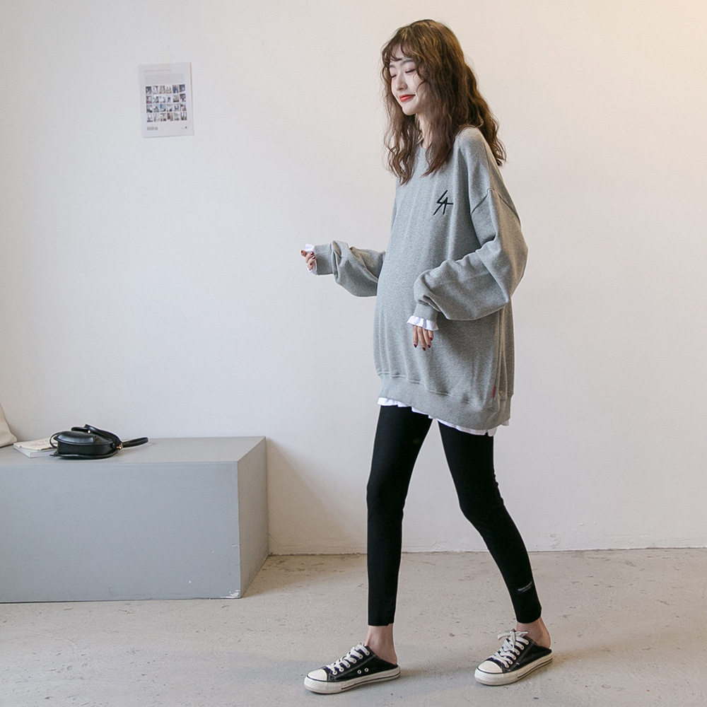 Maternity sweater mid-length version spring and autumn new Korean version fake two-piece round neck pullover long-sleeved top loose large size tide mom