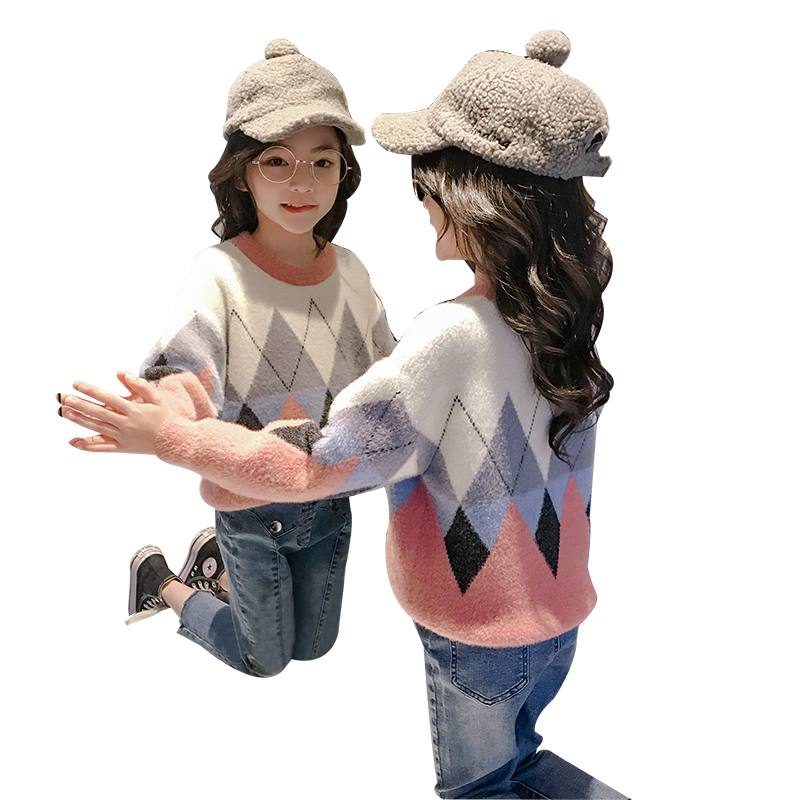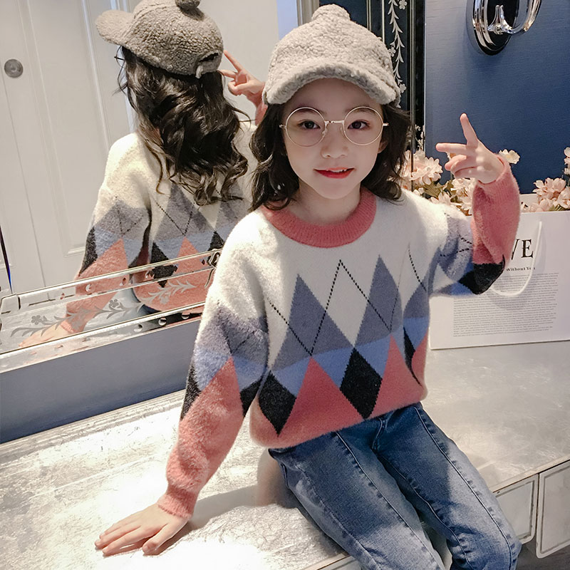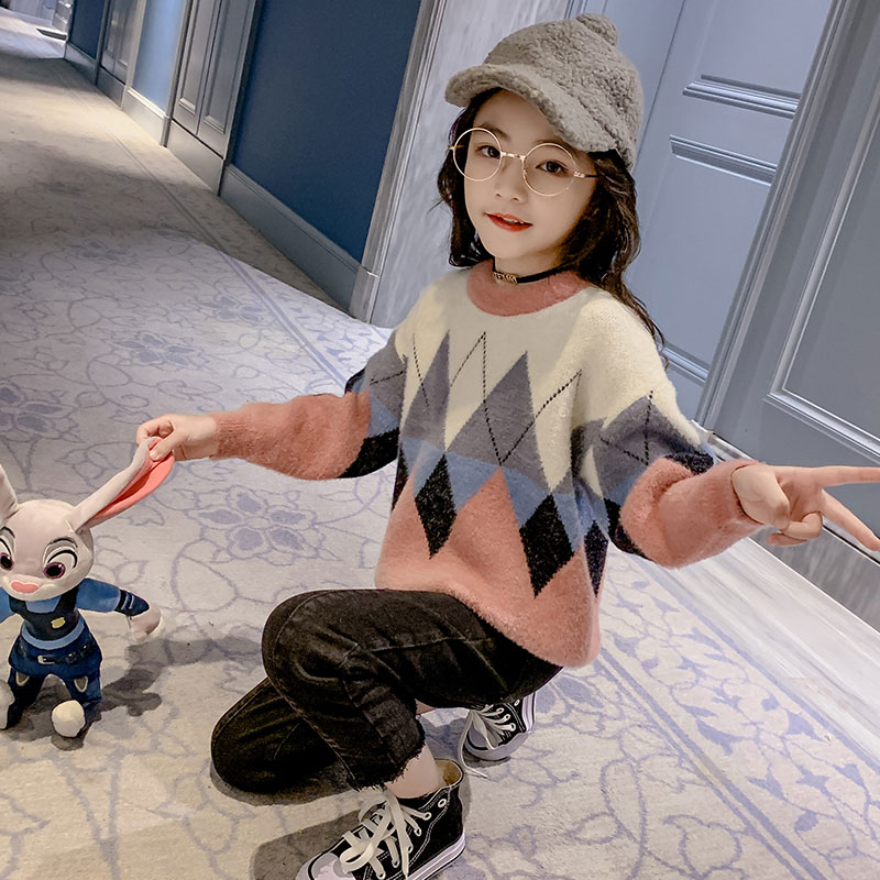 Girl mink pullover sweater autumn winter clothing 2021 new children Girls middle and big children foreign-style knitted sweater