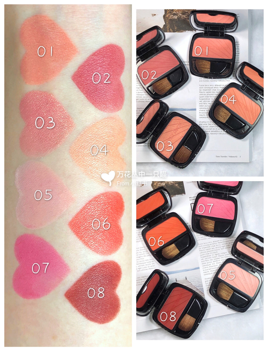 01 Throbbing(pink orange) 02 Heart (dark hummus) 03 Intoxicated(fine glitter peach gold) 04 Tempted(naked apricot) 05 Naive(bright pink)06 Possessive(orange