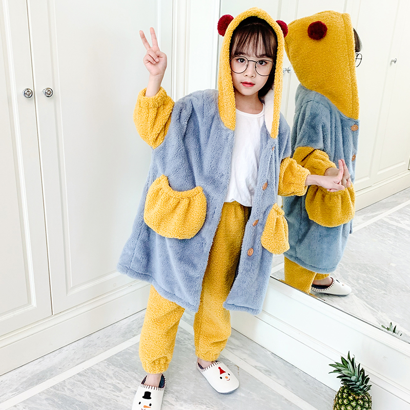Children's autumn and winter pajamas girls coral velvet winter thickened flannel nightgown medium and large children bathrobe set