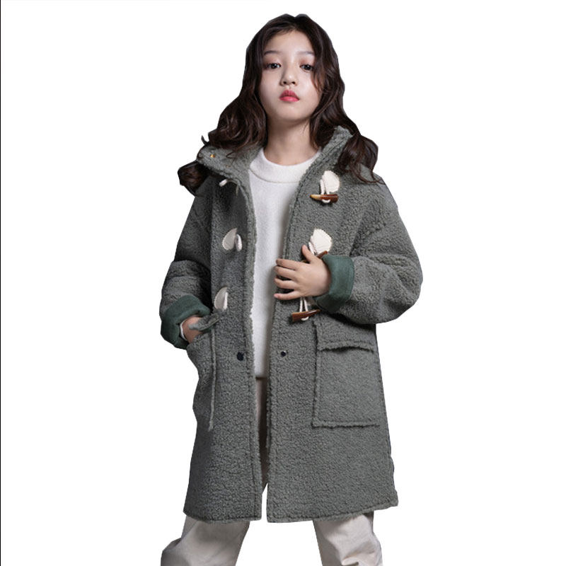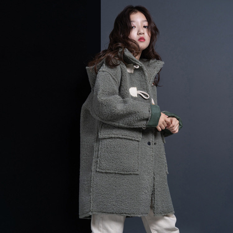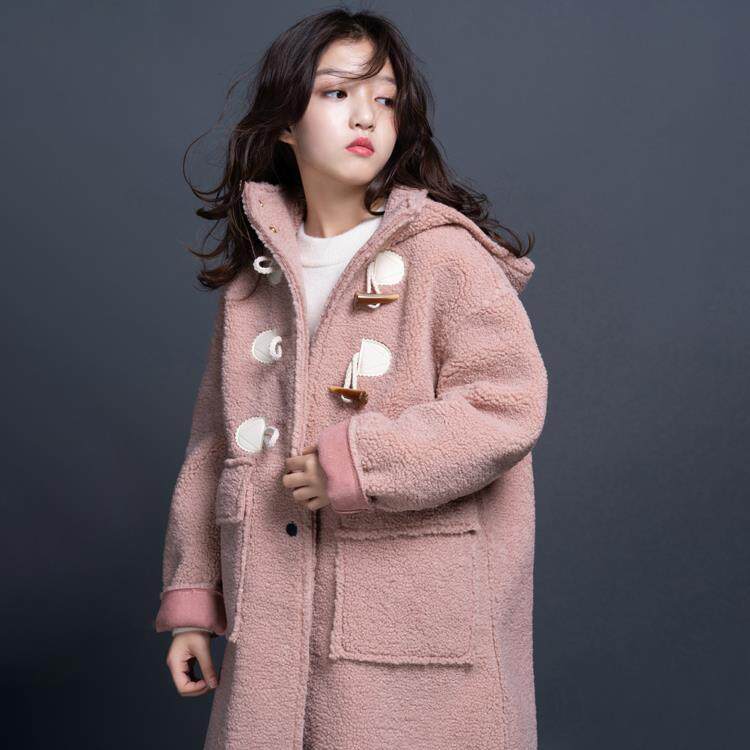 Girls' lamb wool coat 2022 autumn and winter Korean style loose mid-length thickened horn button children's roll-up sleeve coat trendy