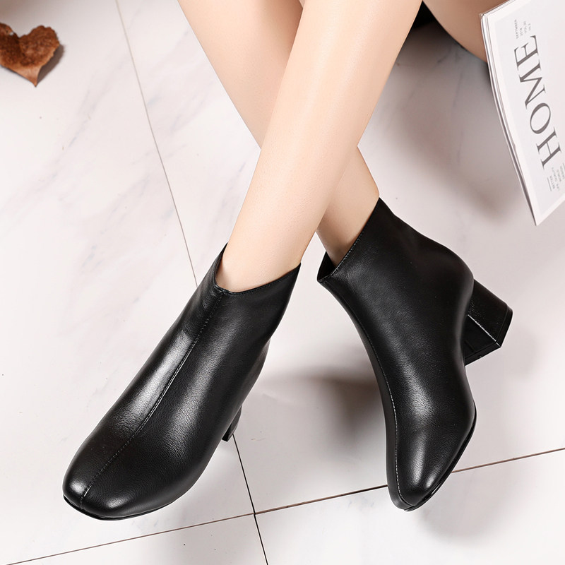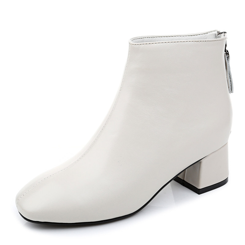 Thick Heel Short Boots Women's 2022 Spring and Autumn Leather Mid Heel Martin Boots Large Size Beige Square Toe Women's Boots Soft Sole Short Single Boots