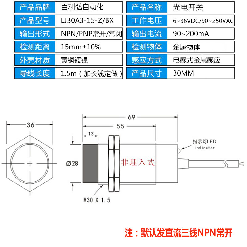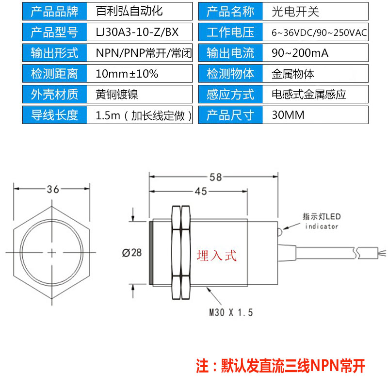 M30 Inductive proximity switch sensor DC three-wire NPN normally open two-wire 12V24V metal sensor switch