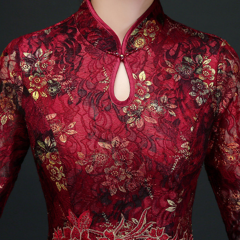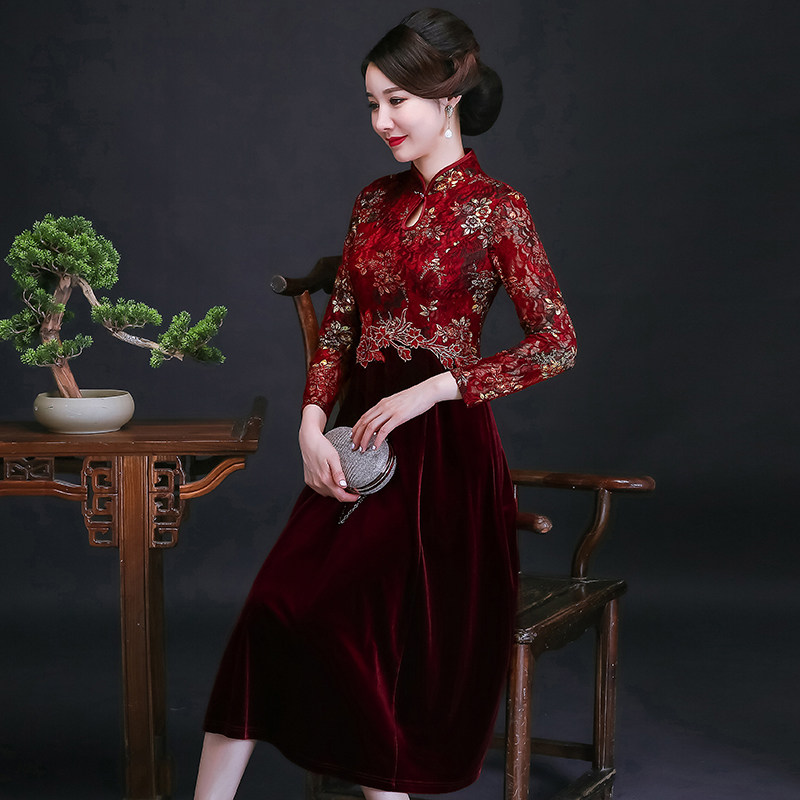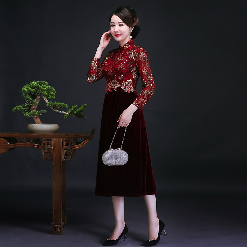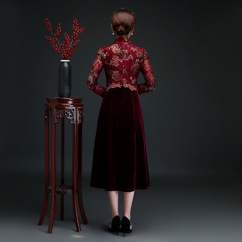 High-end wedding banquet mother's dress gold velvet improved cheongsam noble western style happy mother-in-law to participate in the wedding dress autumn and winter