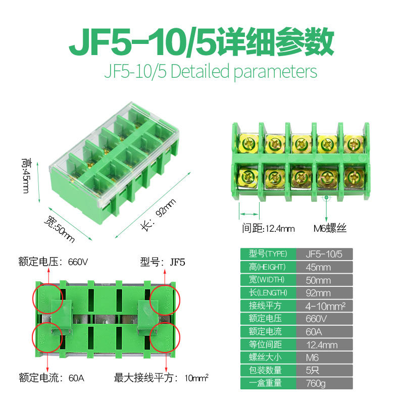 JF5-10 5 closed type wiring terminal rail type terminal European style five terminals 60A copper pieces thick pieces