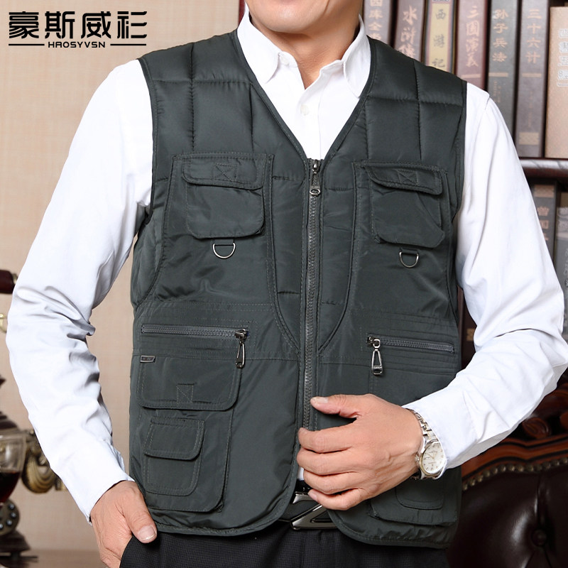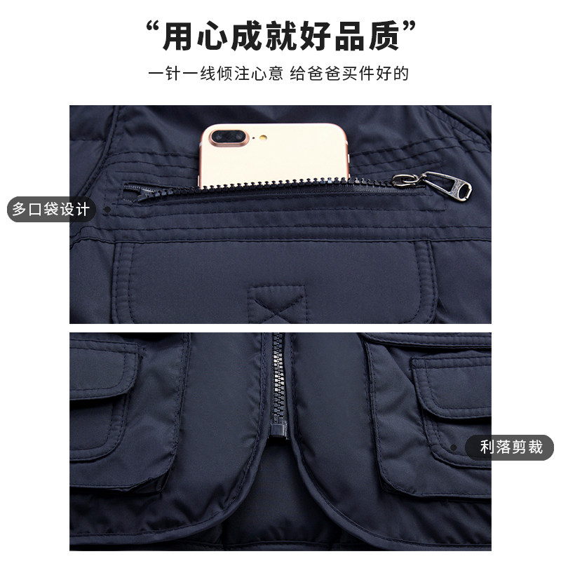 Middle-aged man feather cotton vest man plus cotton vest autumn and winter middle-aged daddy multi-pocket cotton shoulder