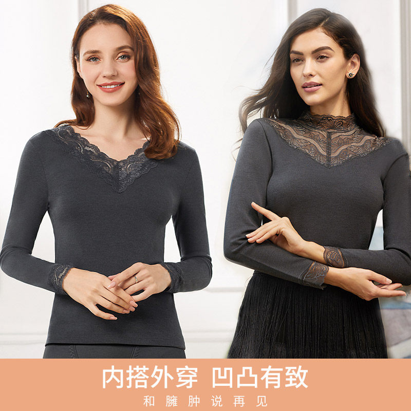 Ancient now red Ben life elastic lace V collar small high collar autumn clothes warm blouse women 3K194 3K294-P