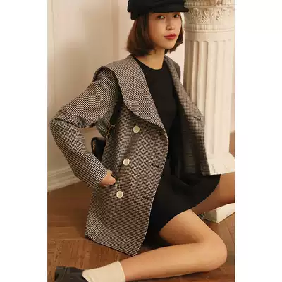 Retro navy collar long-sleeved wool woolen coat Houndstooth mid-length jacket female