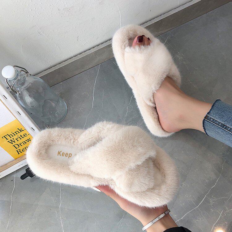 Korean version Ins Wind cute Girl Heart Rabbit Velvet Cross Non-slip Lady Thick Bottom Home Home Fur Plush Slippers Winter