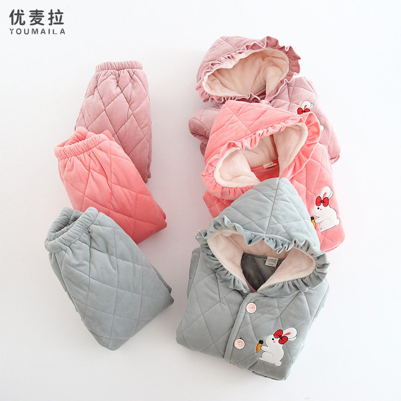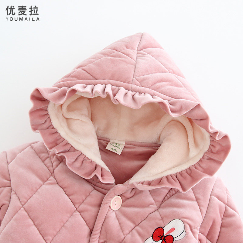Winter children's pajamas set girls three-layer thickened quilted medium and big children's flannel mid-length hooded home clothes