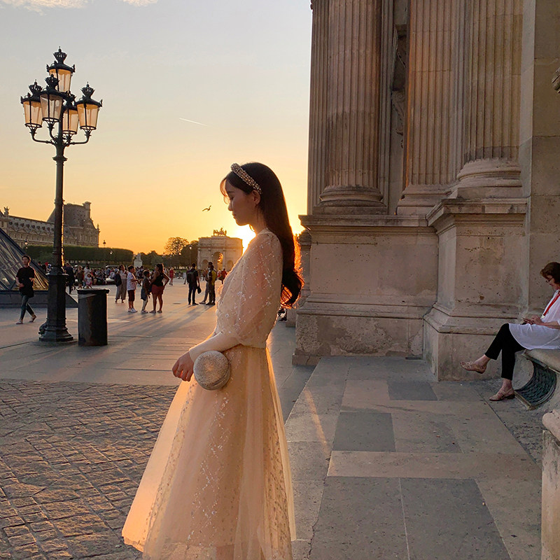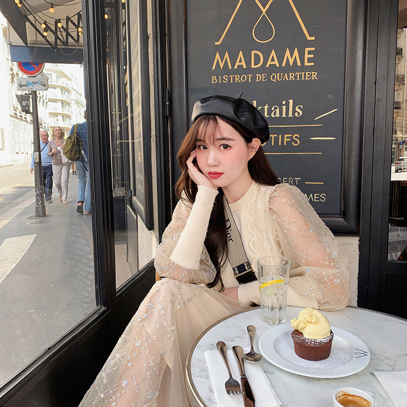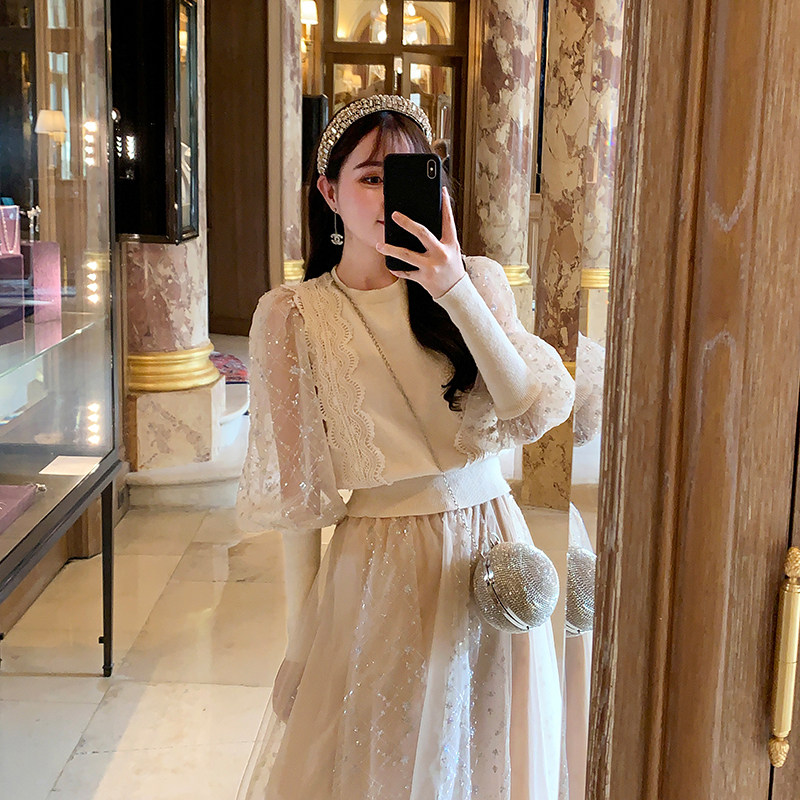 Yang small roll lantern sleeve mesh stitching knit shirt top Super fairy medium long skirt set two-piece female spring
