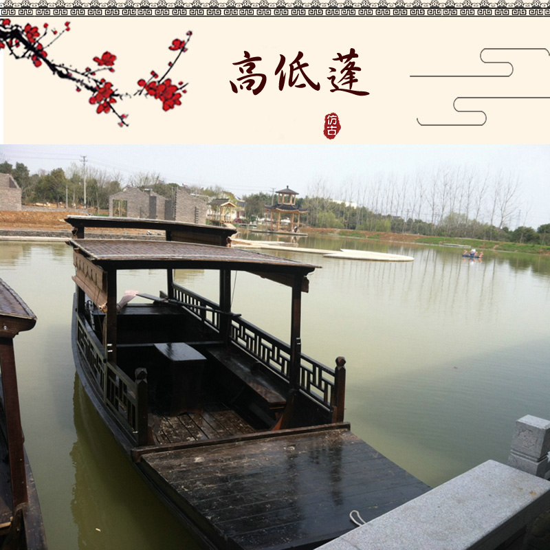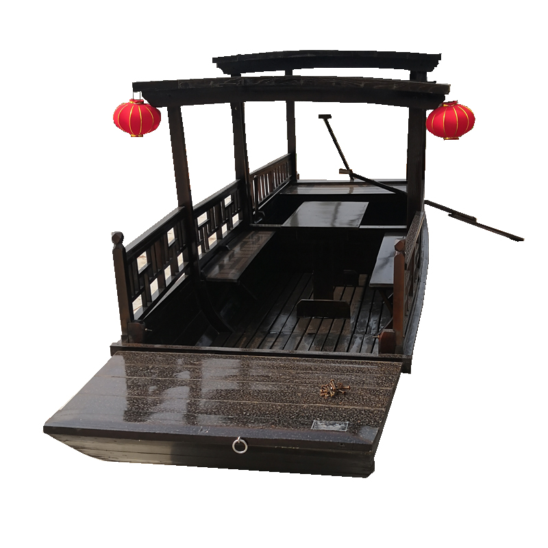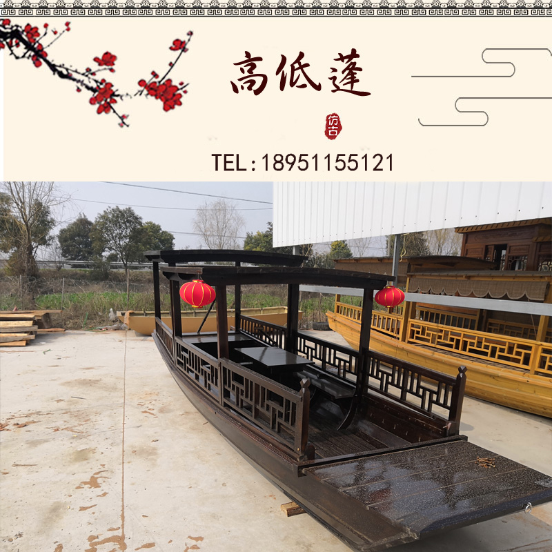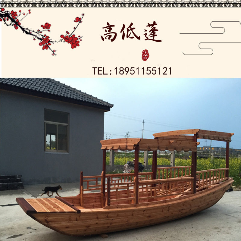 Antique wooden boat fishing boat single canopy solid wood dining water decoration electric sightseeing tourist boat hand rowing high and low canopy boat