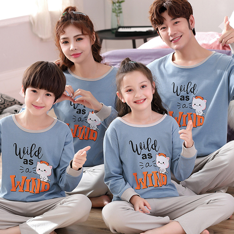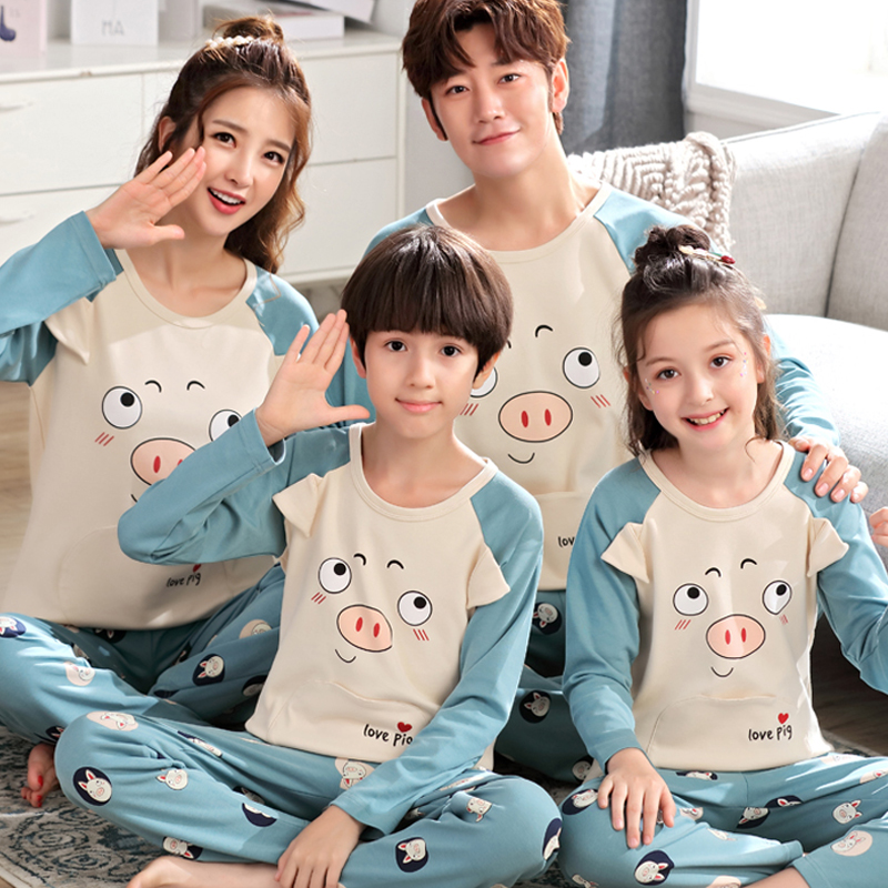 Parent-child sleepwear long-sleeved boy a family of three spring and autumn season thin pure cotton piggy peech mother woman's home suit suit