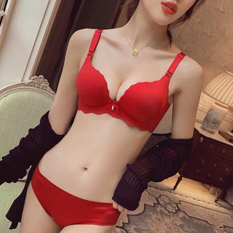Red wedding bridal underwear Ladies ' Year of Life Thickened gathered Small chest bra Sexy Rimless Underwear Set