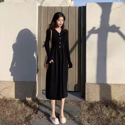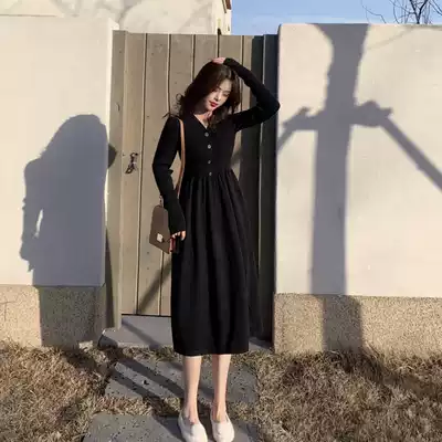 Small black skirt with waist-bottom knitted autumn and winter dress women's long sweater skirt over the knee temperament