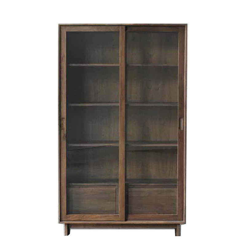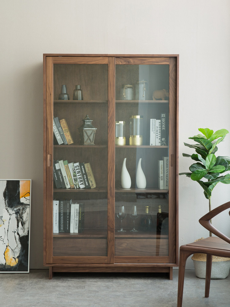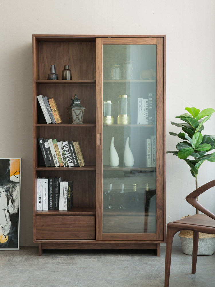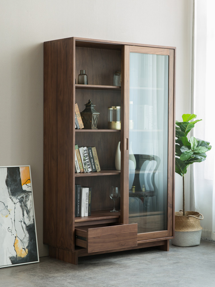 Nordic all solid wood bookcase modern minimalist Japanese glass door vertical cabinet black walnut living room display cabinet shelf
