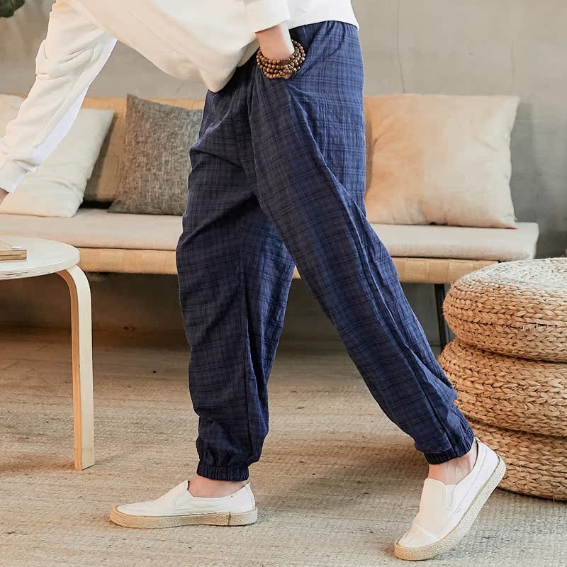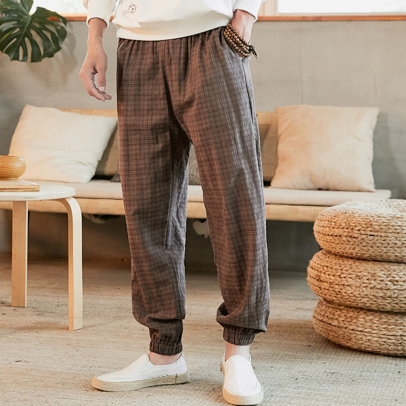 Spring men's cotton and hemp Harlan pants Chinese style lantern beam pants Large size youth casual plaid long pants Men's clothing