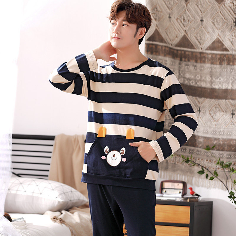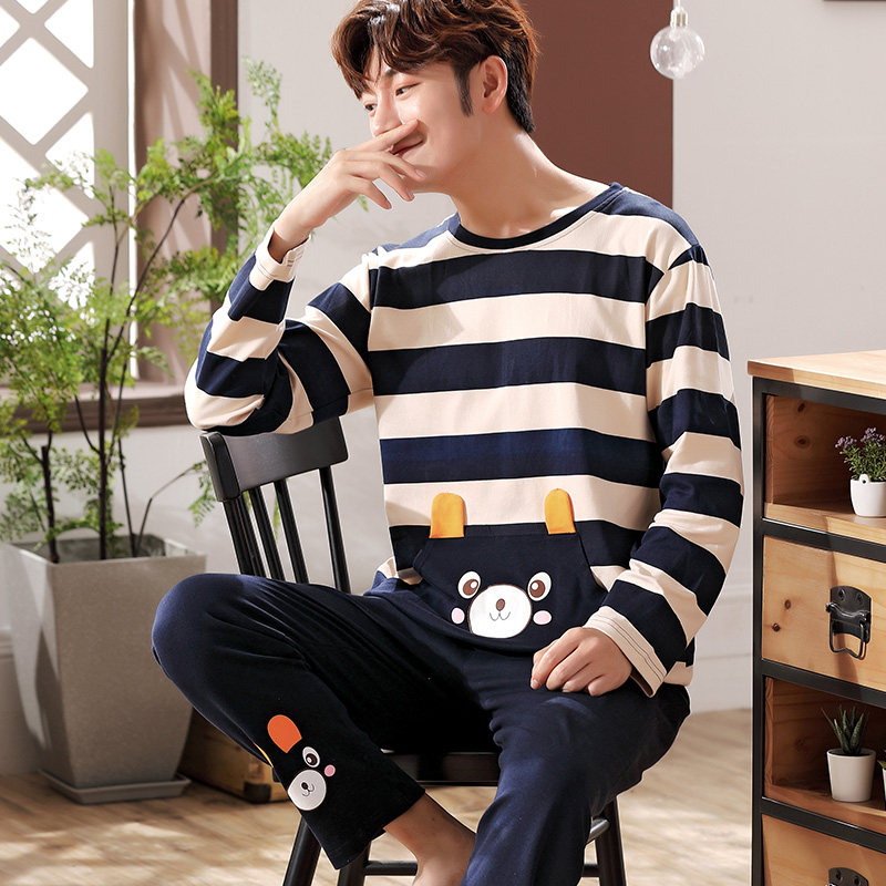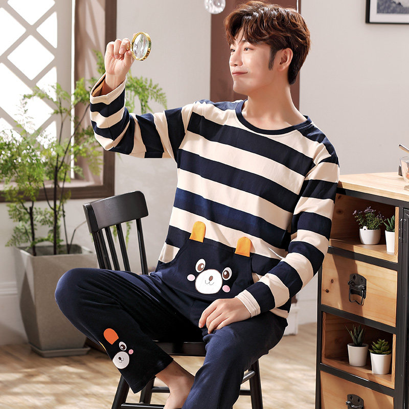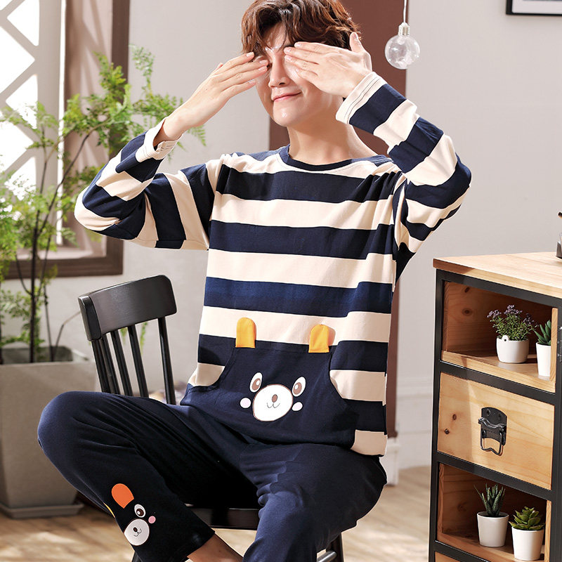 Zhan Lun pajamas men's spring and autumn cotton long-sleeved striped cartoon teenagers autumn and winter big children's home clothes suit