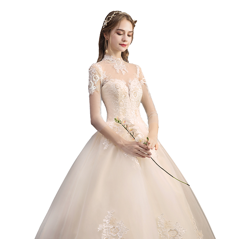 Main light wedding dress 2021 new bride thin champagne color Sen department one shoulder high collar long sleeve simple French dream