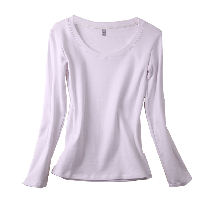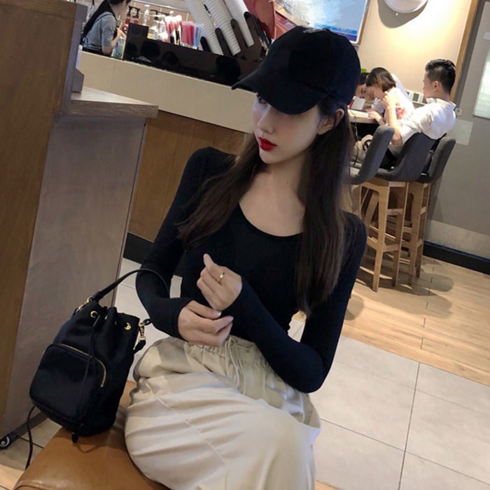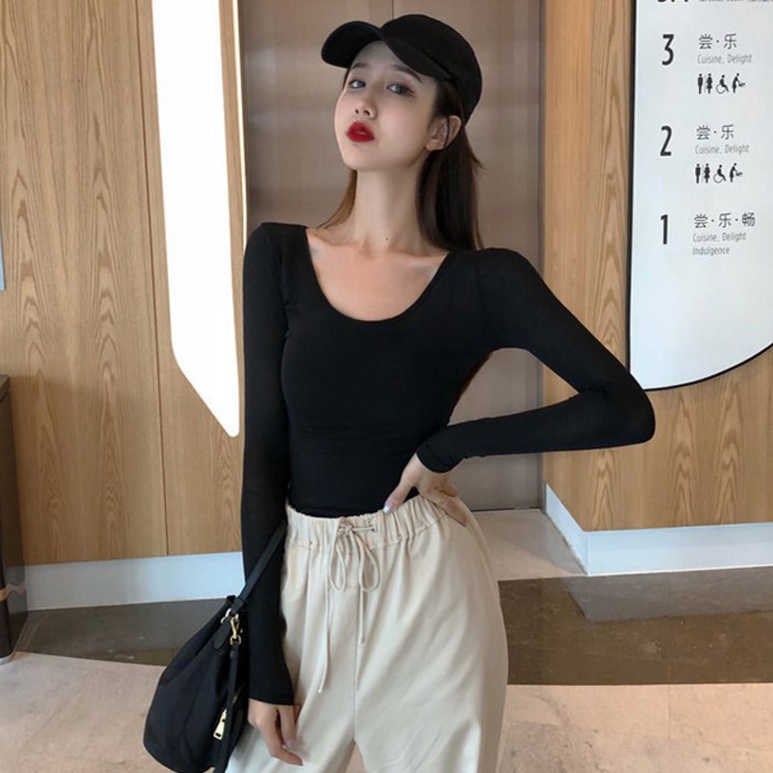 Spring Summer Pure Cotton Low Collar Inner Hitch Woman Long Sleeve T-shirt Tight Inside Lap Clothes Large Neckline U Collar Burst Milk Large Blouse Tide