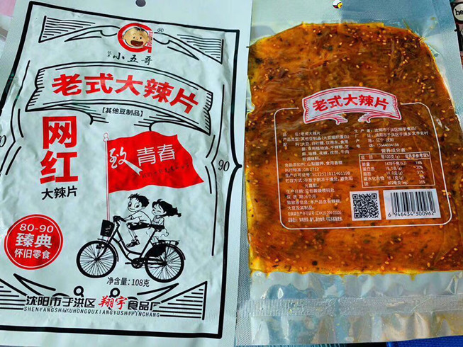Little brother old-fashioned spicy slices 8090 nostalgic spicy slices Hand-torn bean skin net red snacks 108g*5 packs 9 9 free shipping