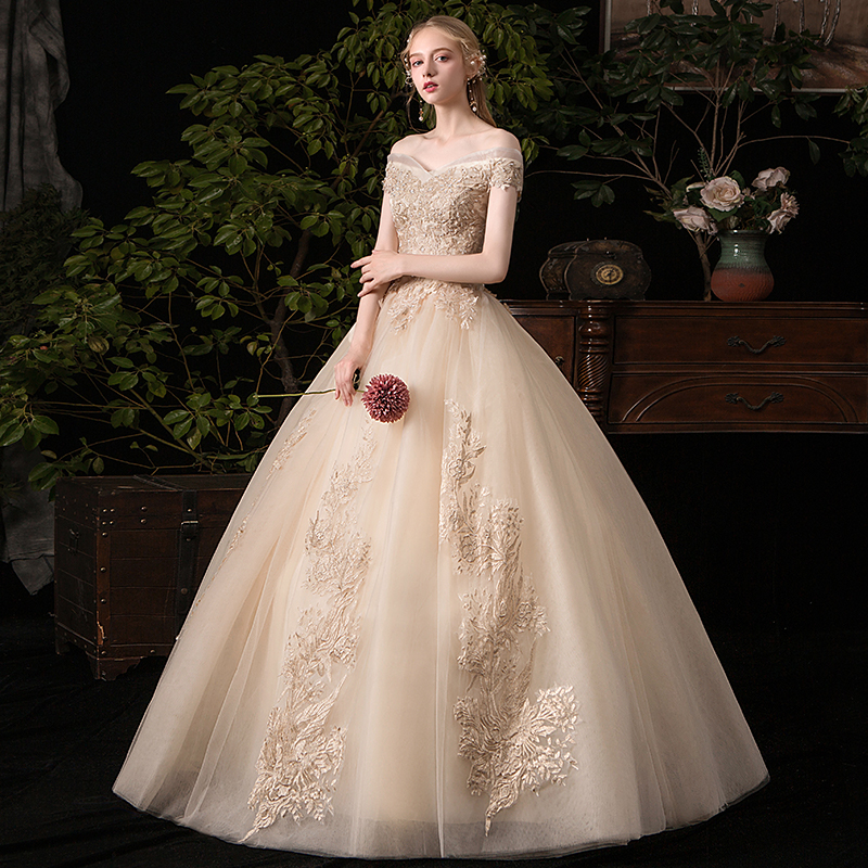 Champagne new master wedding dress bride 2022 - a - word court French starry lavish autumn woman