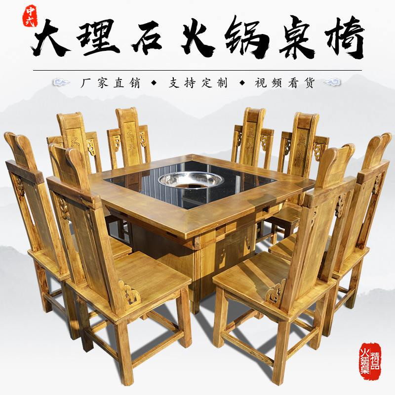 Fire Pot Shop Round Marble Hot Pot Table And Chairs Combined Smoke-free Induction Cookery Integrated Hot Pot Table Restaurant Commercial