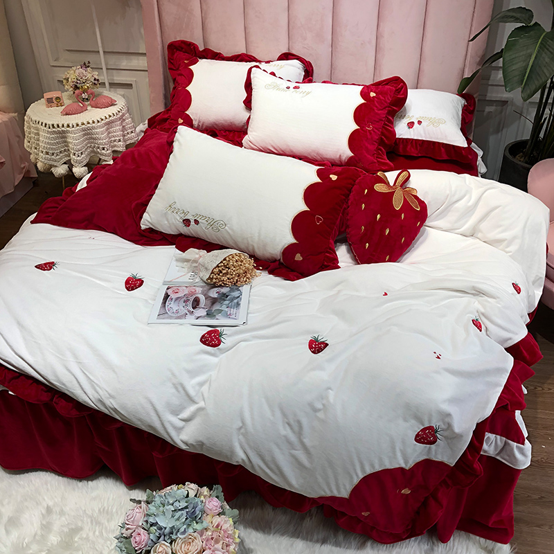 Bed skirt delicate girl heart baby velvet bed four-piece set Crystal velvet winter milk coral velvet Strawberry quilt cover