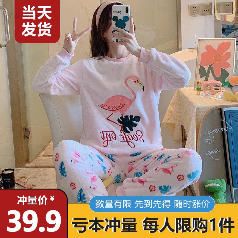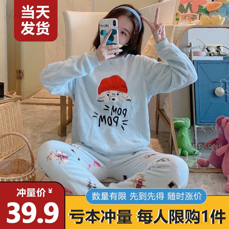 Autumn Winter Coral Suede Pajamas Woman Winter Plus Suede Thickened Warm Cute Flange Suede Suit Student Long Sleeve Home Clothing