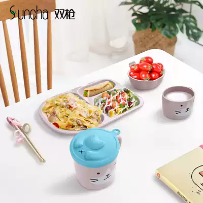 Double gun split food plate cute cartoon children rice husk tableware Korean style with lid water cup flat head learning chopsticks