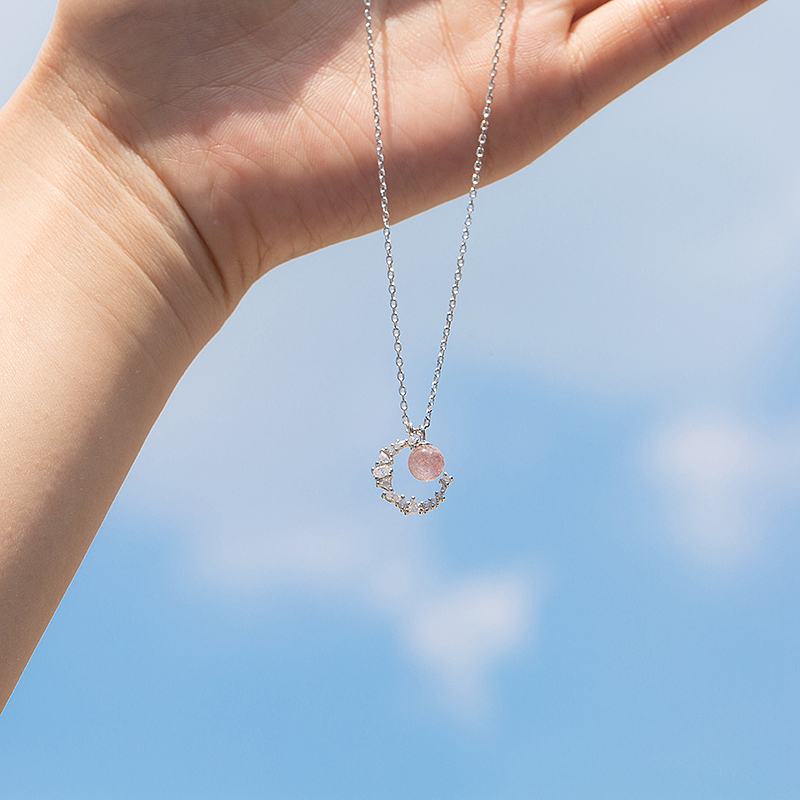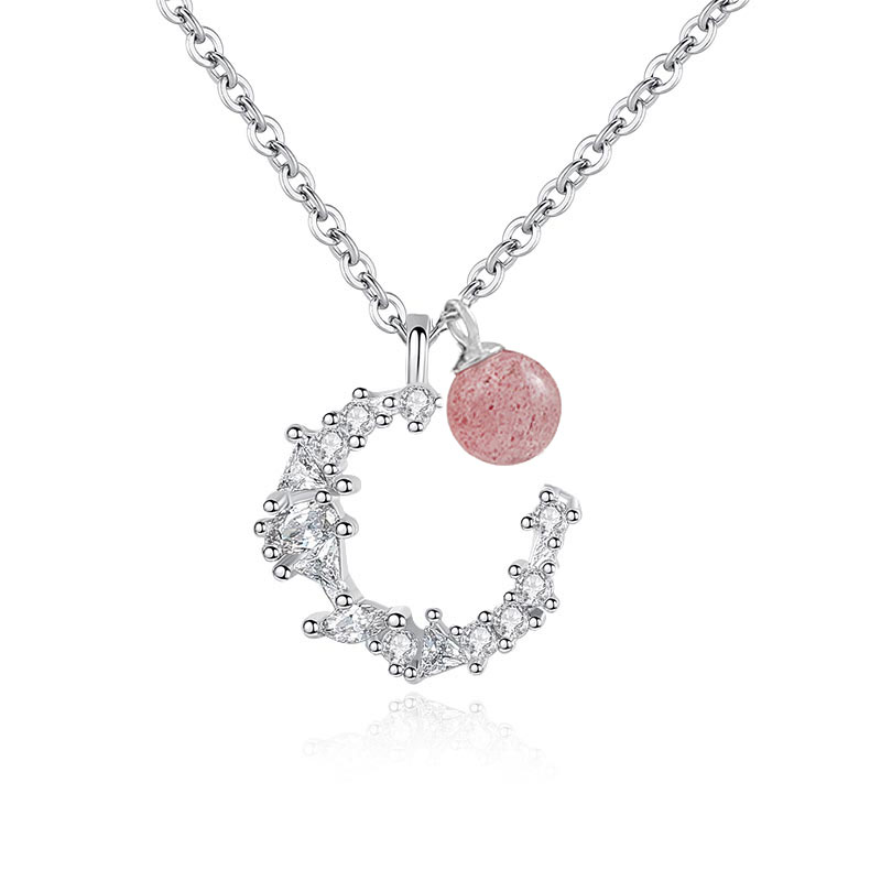 s925 Pure Silver Strawberry Crystal Crescent Moon Tooth Necklace Woman Clear New Recruit Peach Blossom Transfer Temperament Student Shiny Drill Moon Lock Bone Chain