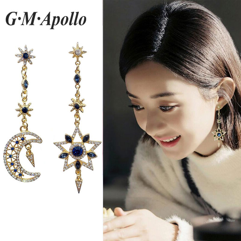 Retro Exaggerated Temperament Stars Moon South Korea Long Version Asymmetrical Minimalist Earrings S925 Ear-pin Ear Pendant Personality