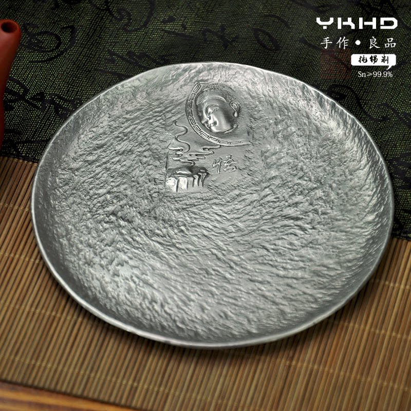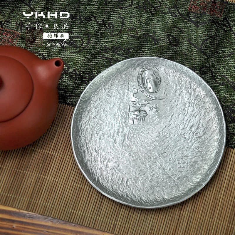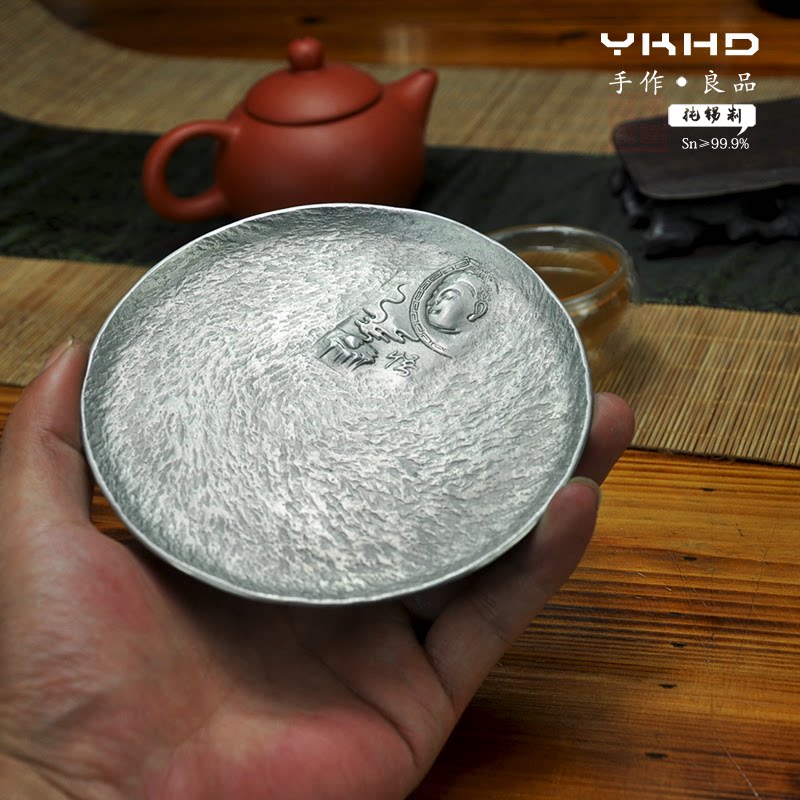 YKHD hand-made pure tin 999 Wu rock pattern simple round pure tin tea saucer humanistic tea ceremony utensils pot cup holder